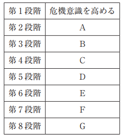 それでは、図中のA~Gに入る選択肢を見ていきましょう。 J. P. コッターの「組織変革の8 段階モデル」については知らない方も多いと思いますので、試験で初見の場合どのように解いていくかを考えていきます。 第1段階は図のとおり