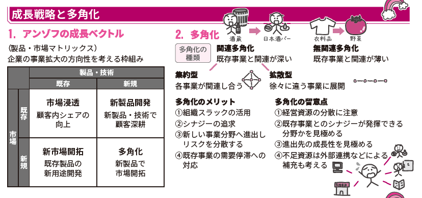 食品メーカーA社は、日本国内の一般消費者向けのシリアルの開発・製造・販売を行う専業企業である。同社は、現在、今後の成長戦略のための施策を検討している。I. アンゾフの成長マトリクスの考え方に基づく記述として、最も適切なものはどれか。