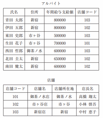 下表は、ある中小企業の“アルバイト”表と“店舗”表である。この 2 つの表に対して、次の SQL 文を実行した場合に得る結果として、最も適切なものを下記の解答群から選べ。
