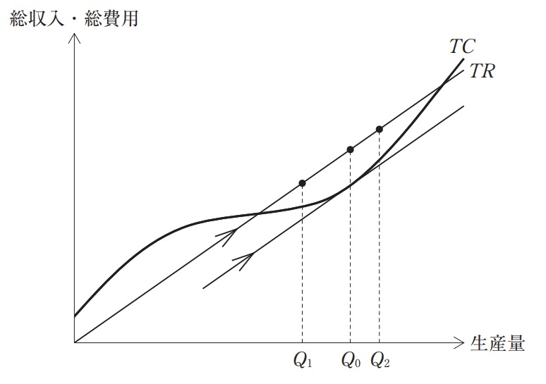 b Q0 の生産量では、総収入曲線の傾きと、総費用曲線の接線の傾きが等しくなっており、利潤最大化と最適生産が実現している。