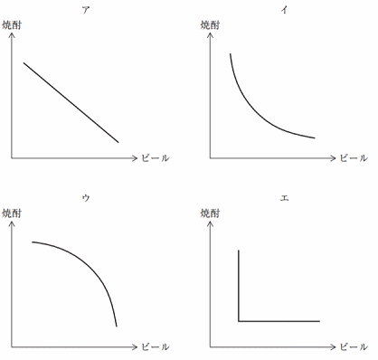 Aさんは、夕食時にビールと焼酎を飲むことにしている。Aさんの効用水準を一 定とした場合、ビールを 1 杯余分に飲むことと引き換えに減らしてもよいと考える 焼酎の数量が、徐々に減ることを描いた無差別曲線として、最も適切なものはどれ か。