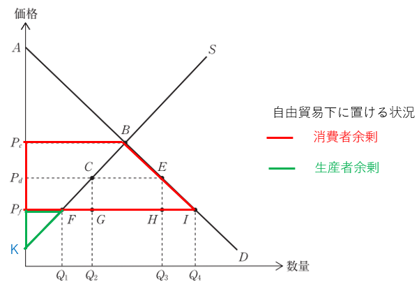 まず前提を整理します。閉鎖経済では価格は Pc、自由貿易では国際価格 Pf に低下します。