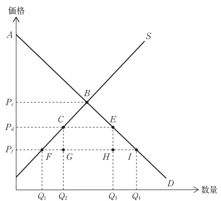 ある国際的に規格化された財に対する関税の効果を考える。国際市場で Pf の価格が成立している当該財の国内需要曲線は D、国内供給曲線は S である。したがって、貿易を行わない閉鎖経済の下では、Pc の市場価格が成立する。