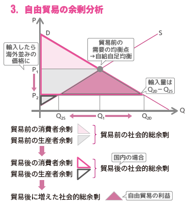 このとき、国内供給量は Q1、国内需要量は Q4 となり、その差が輸入量です。