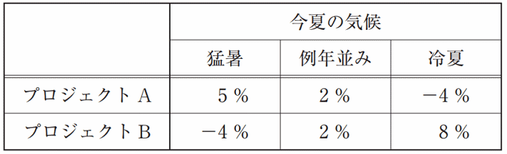 E社は、2つのプロジェクト(プロジェクトAおよびプロジェクトB)の採否について検討している。両プロジェクトの収益率は、今夏の気候にのみ依存することが分かっており、気候ごとの予想収益率は以下の表のとおりである。なお、この予想収益率は投資額にかかわらず一定である。また、E社は、今夏の気候について、猛暑になる確率が40%、例年並みである確率が40%、冷夏になる確率が20%と予想している。