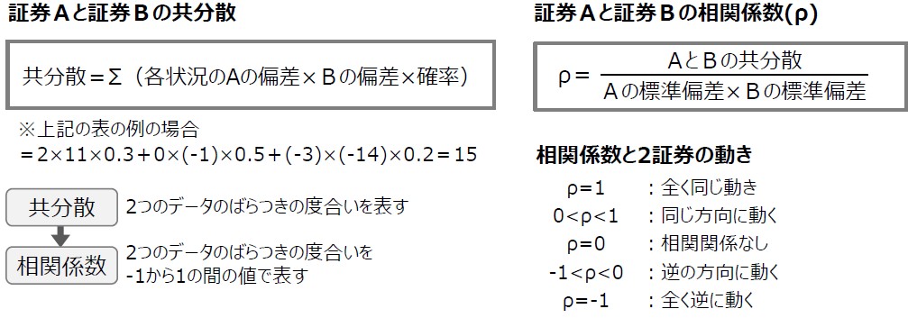上の解説より、それぞれの案の相関係数がプラスであれば、共分散もプラスとなり、相関係数がマイナスであれば共分散もマイナスとなるといえます。