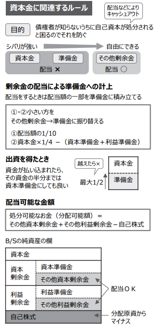 B/S の純資産の欄には、資本⾦、準備⾦、その他剰余⾦などの項⽬があります。これらはすべて⾃⼰資本ですが、債権者保護の観点などからそれぞれその取り扱いに関するルールが設けられてます。これは、債権者が知らないうちに⾃⼰資本が処分(配当などにより⾃⼰資本を外部に流出させてしまうこと)され、資本構成が変わり、債権者が不利益を被ることを防ぐためです。純資産の取り扱いに関しては、資本⾦が最も制約が強く、その次に準備⾦、⽐較的⾃由にできるのがその他剰余⾦となります。以下で純資産の取り扱いに関するルールについて 3 点紹介します。1 点⽬は出資を得たときのルールです。会社の設⽴や株式の発⾏をした際に得られた資⾦は資本⾦となります。しかし、そのうちの 2 分の 1 を超えない額については、縛りの強い資本⾦ではなく、それよりも少し縛りの緩い資本準備⾦にしても良い、と会社法で定められています。逆に⾔うと会社の設⽴や株式の発⾏で得られた資⾦のうち、半分以上は資本⾦としなければいけません。2 点⽬は配当可能な⾦額に関するルールです。純資産のうち、配当に充てても良い⾦額のことを分配可能額といいます。配当に充てても良いのは資本⾦のうち、その他資本剰余⾦とその他利益剰余⾦です。分配可能額は、会社法により以下のように定められています。