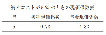 現価係数表(5年・資本コスト5%)を使って NPV(正味現在価値) を計算します。