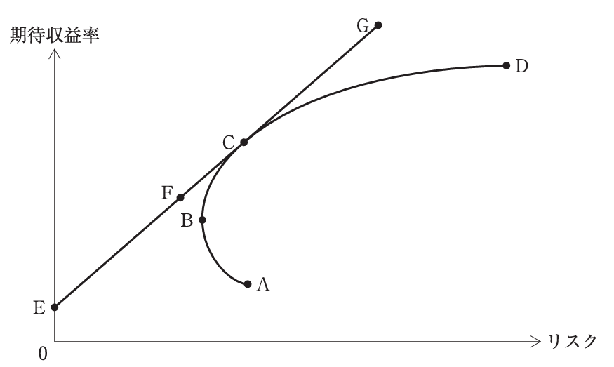 以下の図は、縦軸に投資の期待収益率、横軸に当該投資収益率のリスクをとった平面上に、ポートフォリオ理論の下での、危険資産と安全資産の投資機会集合を示したものである。これに関して、下記の設問に答えよ。なお、点Cは、点Eと点Gを結ぶ直線と、点Aと点Dを結ぶ曲線の接点である。