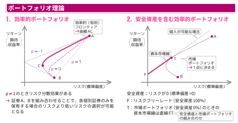 点Aと点Bを結ぶ曲線上のポートフォリオは、同じリスクでより期待収益率が高いポートフォリオを選べるので(点Bから点Cの部分)、点Aと点Bを結ぶ曲線上のポートフォリオを選ぶことはありません。