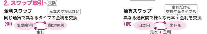 スワップ取引とは、将来にわたってキャッシュフローを交換する取引で、主なものに金利スワップと通貨スワップがあります。なお、ここでいうキャッシュフローとは、契約後に定期的に発生する利息や元本の支払いを指します。