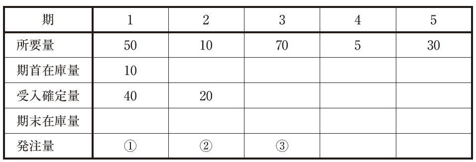 製品Aは調達ロットサイズが20単位で、リードタイムは2期である(n期の期末に発注したものは、n+2期の期首に納入される)。各期の所要量は必ず確保することを前提に、期末在庫量が最小になるように各期の発注量を決定する。1期から5期までの所要量などの情報の一部が下表で与えられているとき、1期から3期までの発注量の合計(表の①〜③の合計)として、最も適切なものを下記の解答群から選べ。