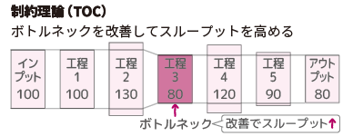 制約理論(TOC:Theory of Constraints)とは、生産や業務プロセスにおいて、制約となる箇所であるボトルネックを特定し、そこを重点的に改善・管理することで、スループット、つまり、生産や業務プロセス全体のパフォーマンスを最大化させようという理論です。