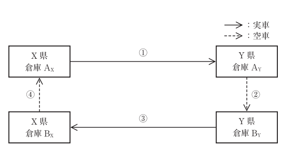 トラックは、①倉庫 AX でA社の貨物を積載してから倉庫 AY へ実車走行した後に、②倉庫 BY へ空車走行して、③倉庫 BY でB社の貨物を積載してから倉庫 BX へ実車走行し、④倉庫 AX へ空車走行した。