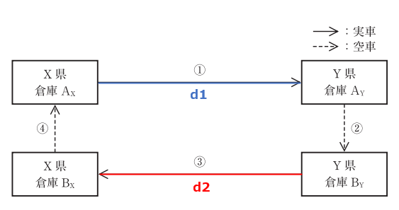 A社の貨物を積載したトラックは、X県の倉庫 AX からY県の倉庫 AY へ貨物を積載して走行(実車走行)した後に、倉庫 AY から倉庫 AX へ貨物を積載せずに走行(空車走行)していた。