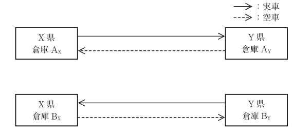 ・トラックの最大積載量は、【取組前】と【取組後】におけるすべての輸送において同じである。また、輸送貨物量は、A社の倉庫 AX から倉庫 AY への輸送と、B社の倉庫 BY から倉庫 BX への輸送においてすべて同じである。