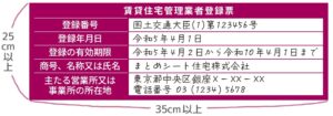 標識の様式は、縦25㎝以上、横35㎝以上の大きさのもので、登録番号、登録年月日、登録の有効期間、商号、名称または氏名、主たる営業所または事務所の所在地(電話番号含む)が記載される形式となっています。